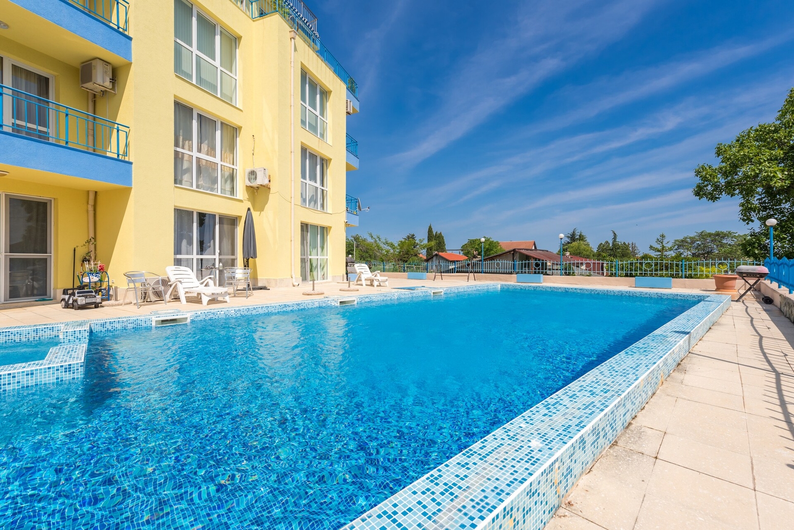 Residential complex with private pool, situated in Chayka/Alen Mak resort. Fast and easy access to Kabakum beach (2.5 km, 7 minutes by car) and Golden Sands beach (4 km, 9 minutes by car). Fast and easy access to center of Varna via Knyaz Boris I boulevard (10 km, around 20 min by car depending on the traffic).