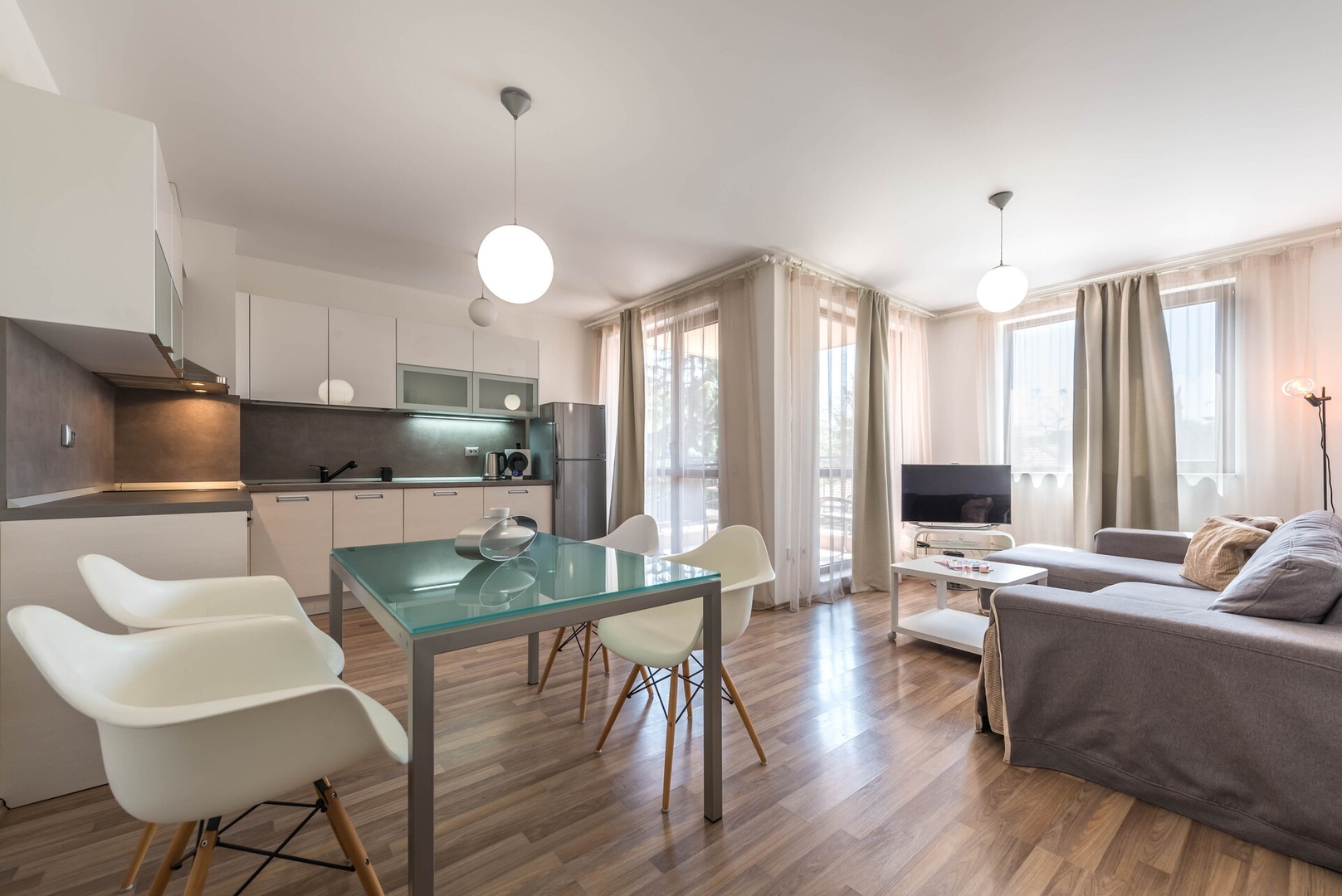 - Bright, open-plan living and dining area with a cozy sofa and flat-screen TV